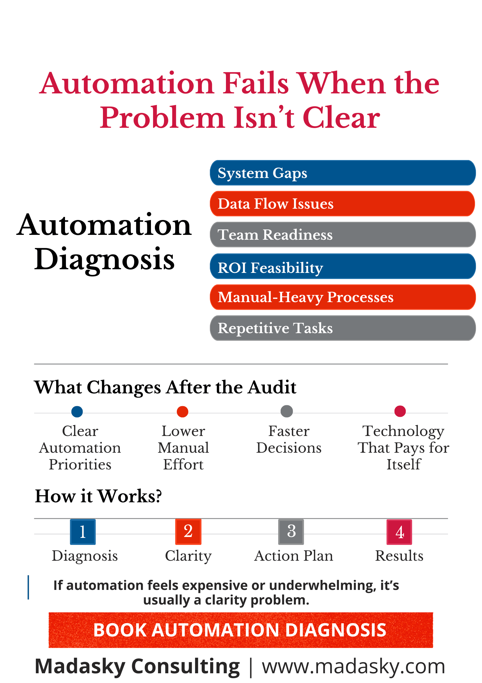 Automation isn't just about technology - it's about identifying where manual processes are costing you time, money, and consistency. We help you find the right opportunities where automation delivers real ROI.
