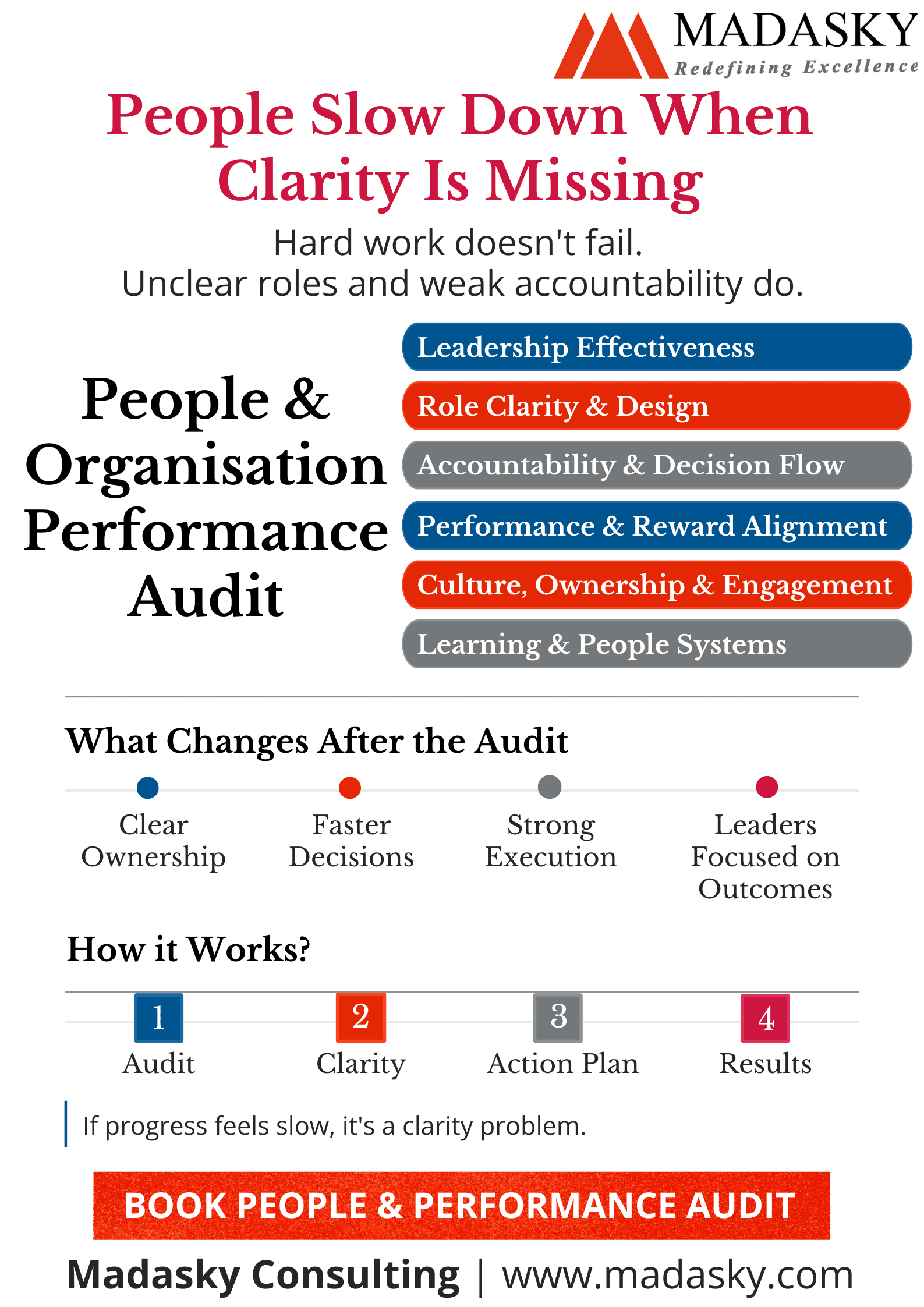 | People & Organisation Audit | Short interviews | Structure, roles, KPIs | Structure, roles, KPIs | Culture, leadership, capability mapping |